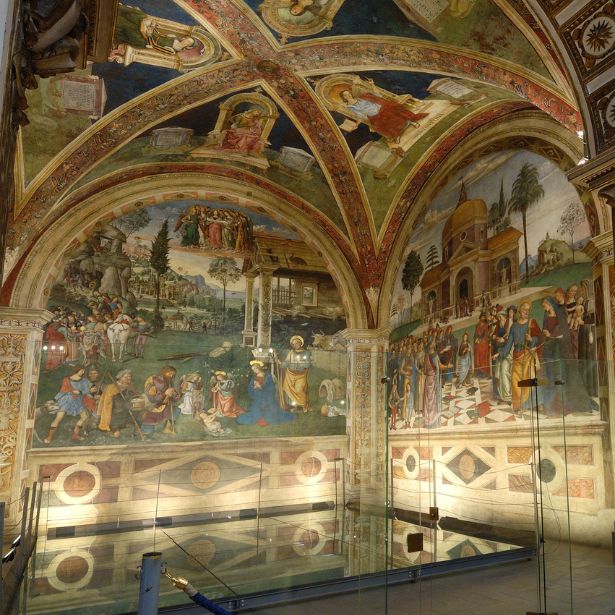 La Cappella Baglioni, all'interno della Chiesa di Santa Maria Maggiore a Spello, è un gioiello rinascimentale. Celebre per gli affreschi di Pinturicchio, raffigura scene della vita di Maria e l'Adorazione dei Magi con colori vividi e dettagli raffinati. Un capolavoro d'arte che testimonia la grandezza del Rinascimento umbro.